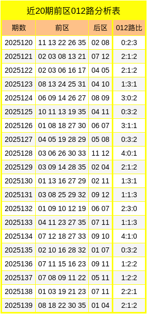 概述分析,第25140期大乐透前区012路比参考3:1:1。